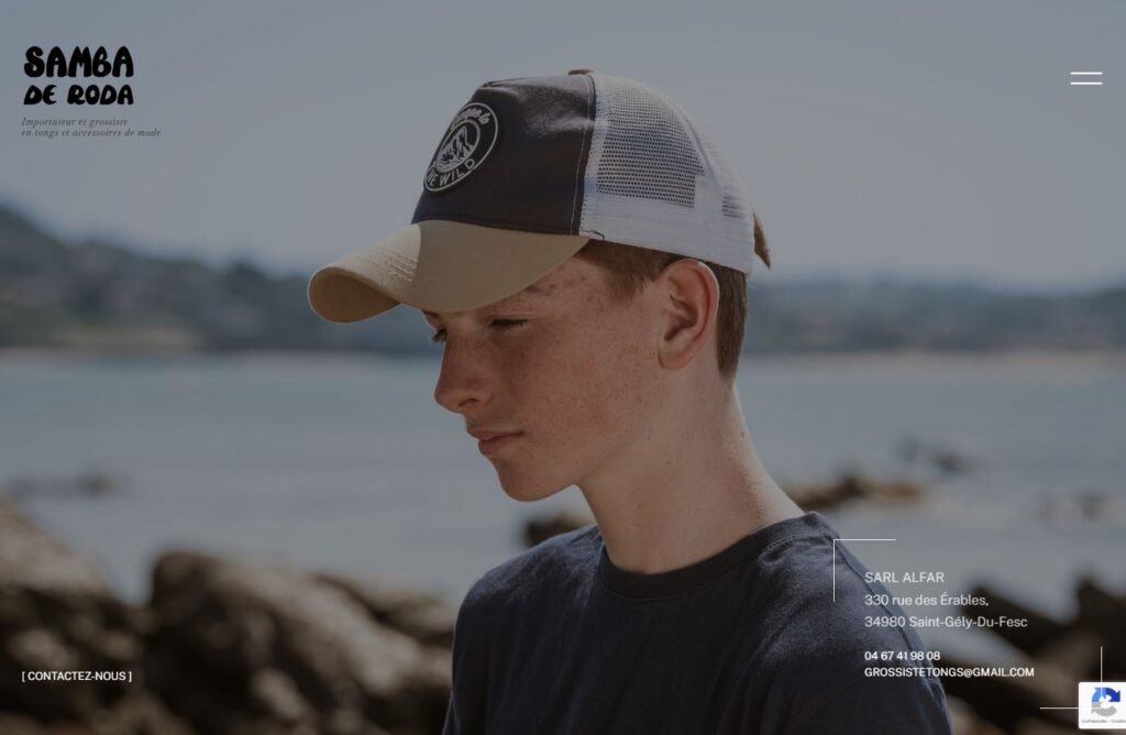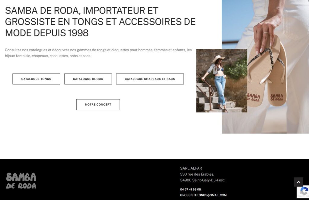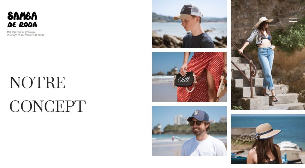 Le site de la société Samba de Roda, grossiste et importateur de produits et accessoires de plage, présentant une sélection de tongs, bijoux, chapeaux et casquettes au sein d’une interface esthétique, moderne et agréable à parcourir.